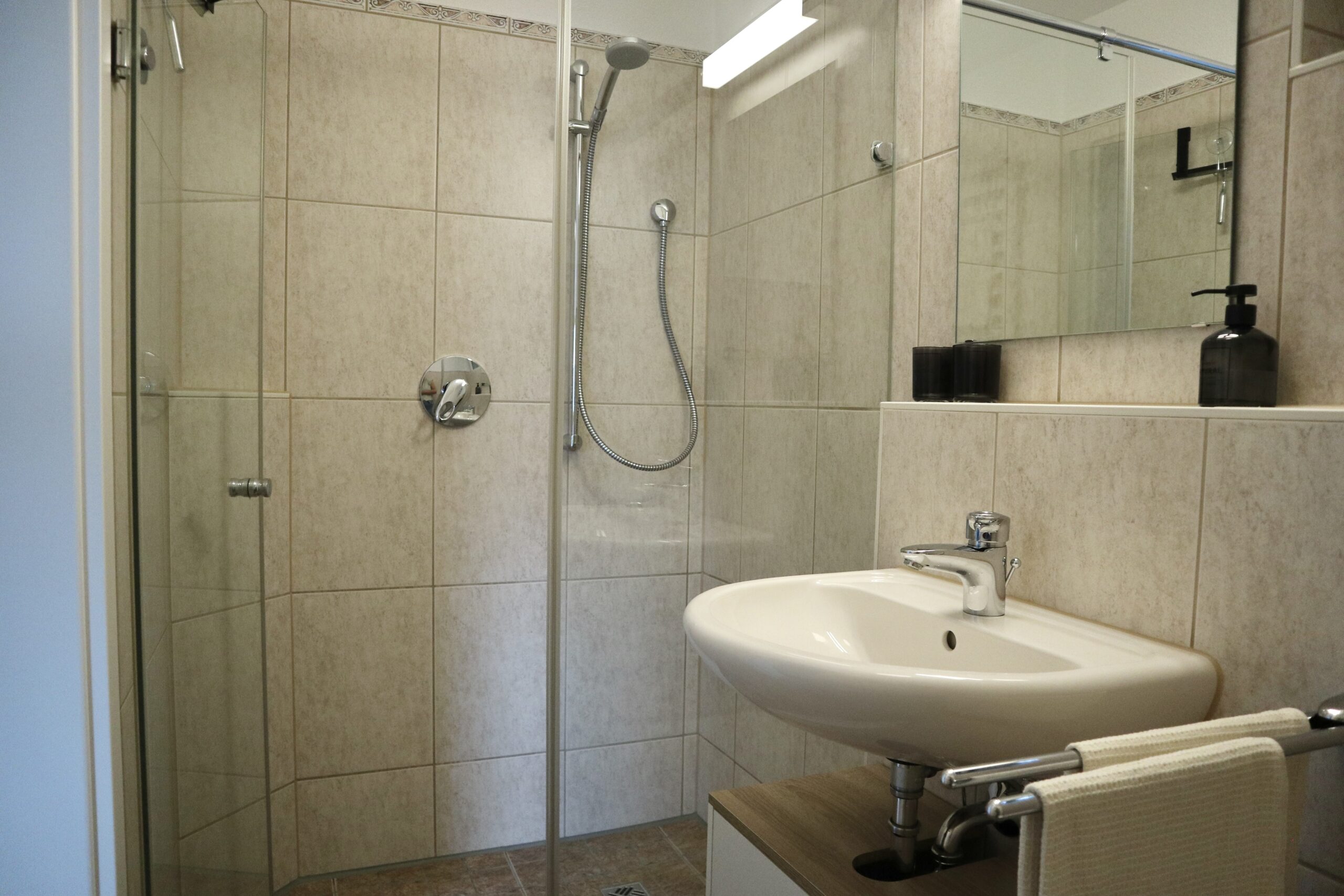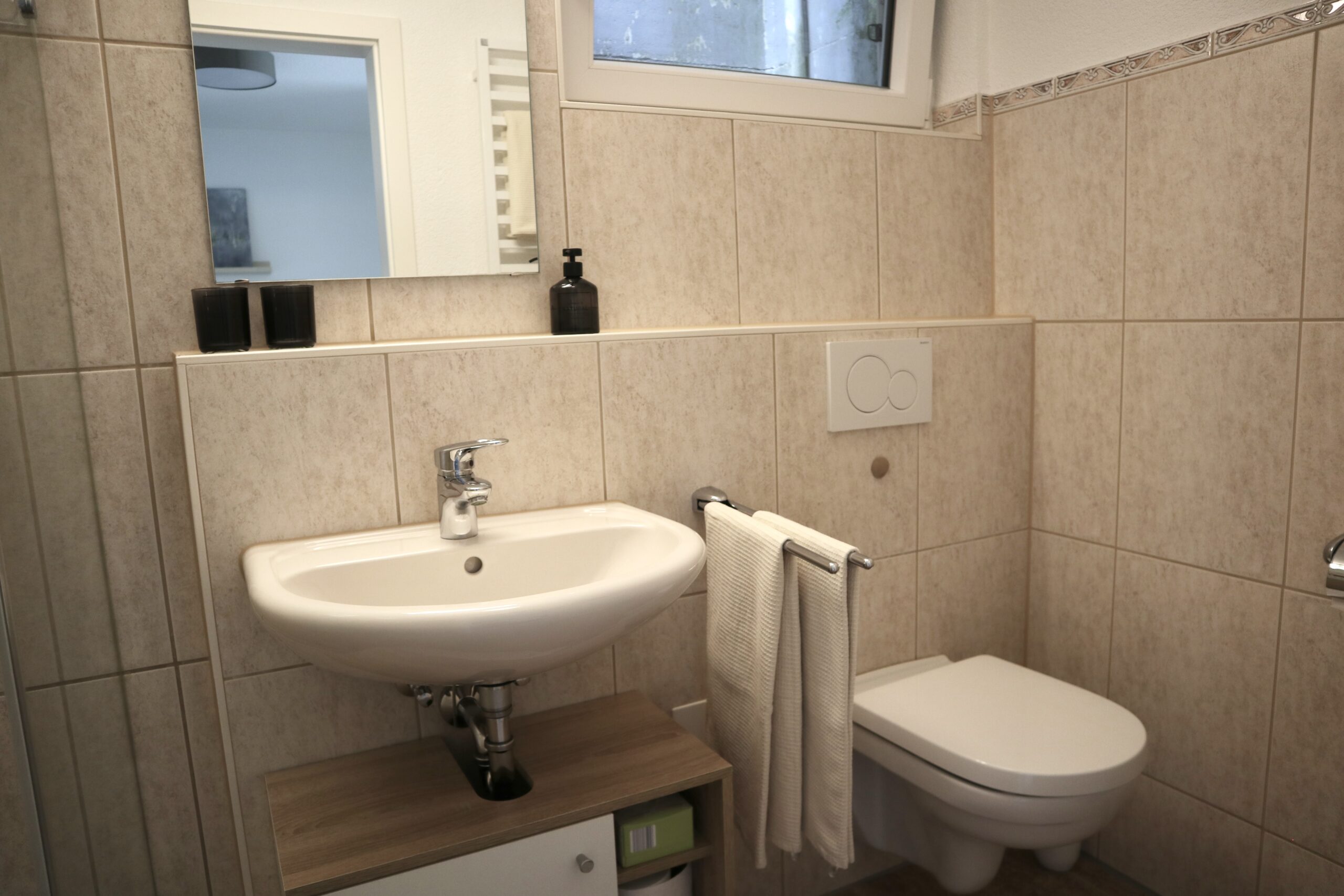 Bodentiefe Dusche, Spiegel, WC, Handtuchheizkörper, Föhn, Toilettenpapier, Handtücher