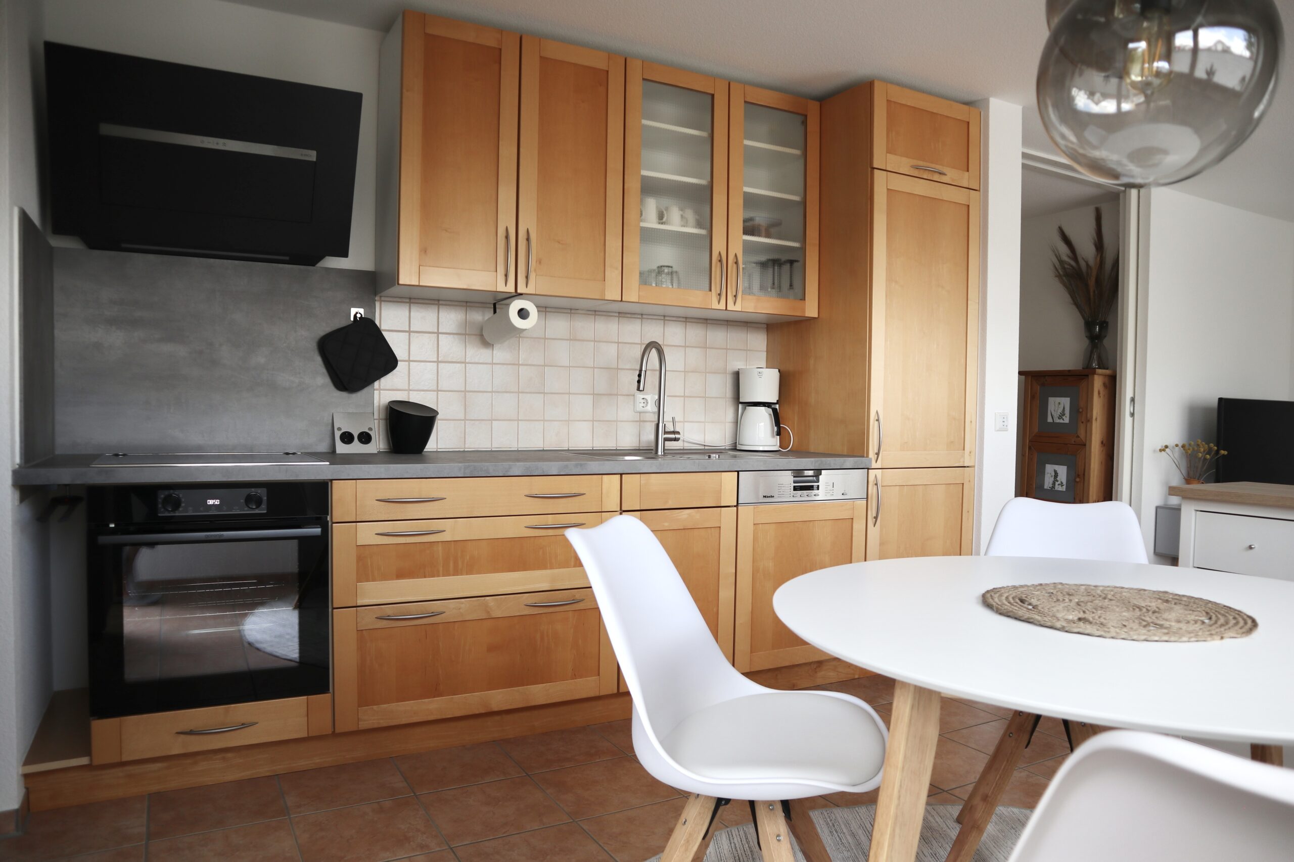 Unsere Ferienwohnung verfügt über eine voll ausgestattete Küche, in der Sie sich kulinarisch entfalten können. Das gemütliche Schlafzimmer mit einem bequemen Doppelbett (Queen Size) und reichlich Stauraum ist durch eine Schiebetür räumlich vom Wohn- und Essbereich getrennt und grenzt direkt an das Badezimmer mit Dusche und WC. Sowohl die private Terrasse als auch das gemütliche Wohnzimmer laden zum Entspannen ein.